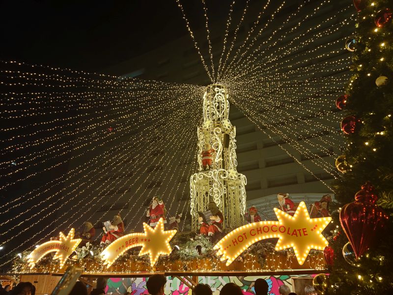冷えてきましたので、弟くん、かめたと、凪パパでジャンボソーセージを食べながら、弟くんと凪パパはホットチョコ、かめたとはホットワインで温まりました。その後、お姉ちゃんと合流し、お姉ちゃんは鴨ローストとホットチョコで温まって、お姉ちゃんのアパートに戻りました。