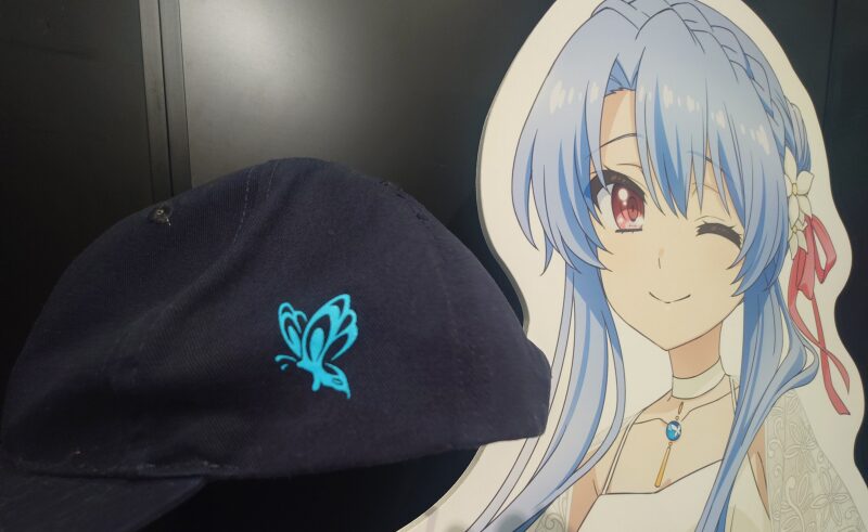 物販では凪パパはヒロインたちのマグカップと七影蝶のお守り、お姉ちゃんは缶バッジを3個購入しました。お姉ちゃんの缶バッジを開封すると、しろは、うみちゃん、紬・静久・羽依里でした。